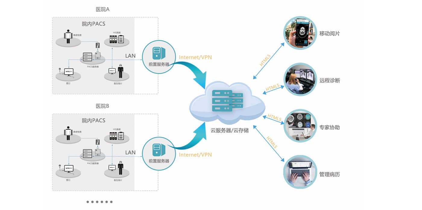 分布在各地的医院,可实现集中存储、全球不限区域的影像共享,互相调阅影像,远程诊断.